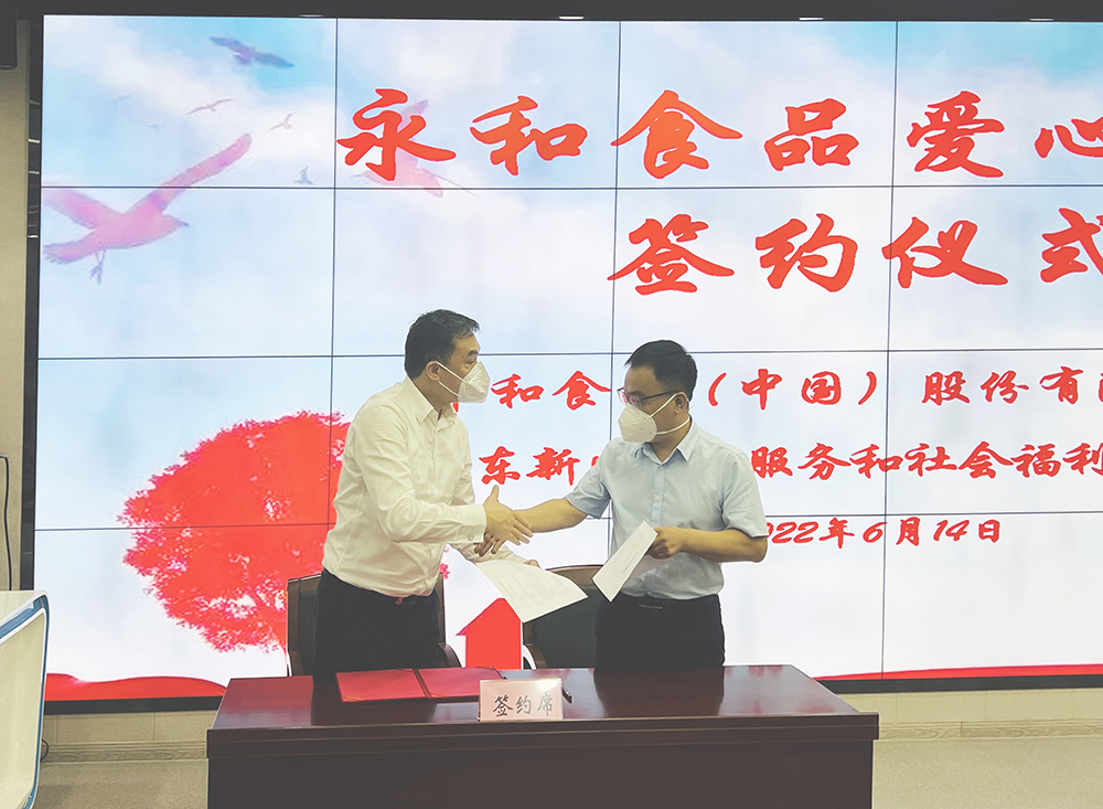 永和食品公司董事長(zhǎng)林建雄(左)和養(yǎng)老服務(wù)和社會(huì)福利事務(wù)中心副主任于明(右)簽署捐贈(zèng)協(xié)議