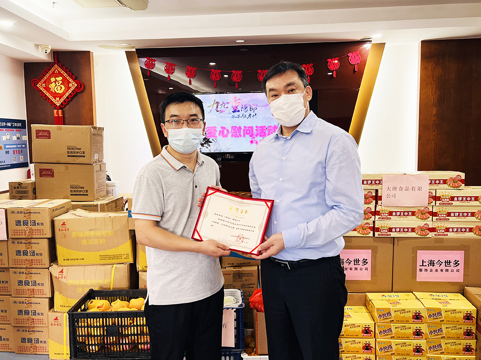 花木敬老院吳院長為永和食品公司頒發(fā)捐贈證書