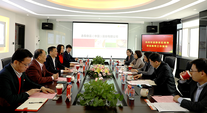 2020年3月26日上午,上海市靜安區(qū)委副書記黃紅、區(qū)投資辦副主任潘冰清、區(qū)委辦副主任王宗輝、區(qū)委調(diào)研科科長曾魁、區(qū)委投資綜合協(xié)調(diào)科科長王軼潔一行蒞臨永和豆?jié){總部調(diào)研慰問,永和食品(中國)股份有限公司林建雄董事長,鄧毅雄副總經(jīng)理、瞿江琴副總經(jīng)理、董事長助理蔡欽安出席本次會議。