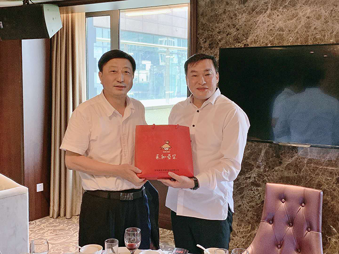 永和食品公司董事長(zhǎng)林建雄(右)向海南省委統(tǒng)戰(zhàn)部副部長(zhǎng),省臺(tái)灣事務(wù)辦公室主任 劉耿(左)贈(zèng)送禮品