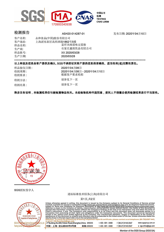 ▲經(jīng)典原味豆?jié){粉檢測報(bào)告